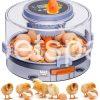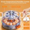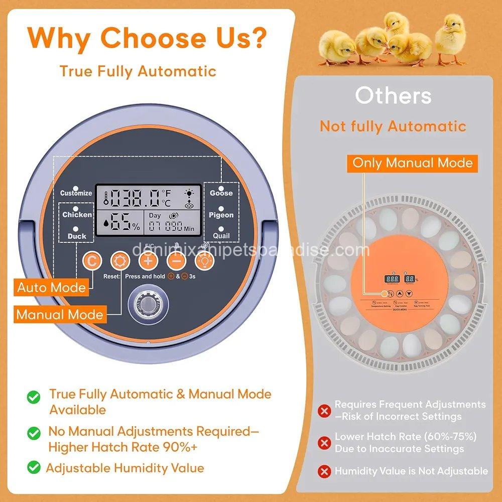 - 🐣 Fully Automatic Chicken Incubator, Hassle-Free Hatching: No more manual adjustments! Simply select the egg type, and our smart egg hatching incubator automatically sets the ideal temperature and humidity for successful hatching. Unlike other so-called “automatic” incubators, ours requires no manual parameter setup. Prefer custom settings? Our chicken egg incubator also allows full customization of temperature and humidity, providing a more flexible incubation experience.💧 Smart Auto-Watering, Effortless Humidity Control: Say goodbye to gravity-fed water bottles and constant refills! Our advanced water pump system automatically supplies the perfect amount of water, maintaining precise humidity levels throughout incubation. The large water tank fills once and adjusts moisture as needed, eliminating the risk of over- or under-humidification. More accuracy, less work, better hatching!