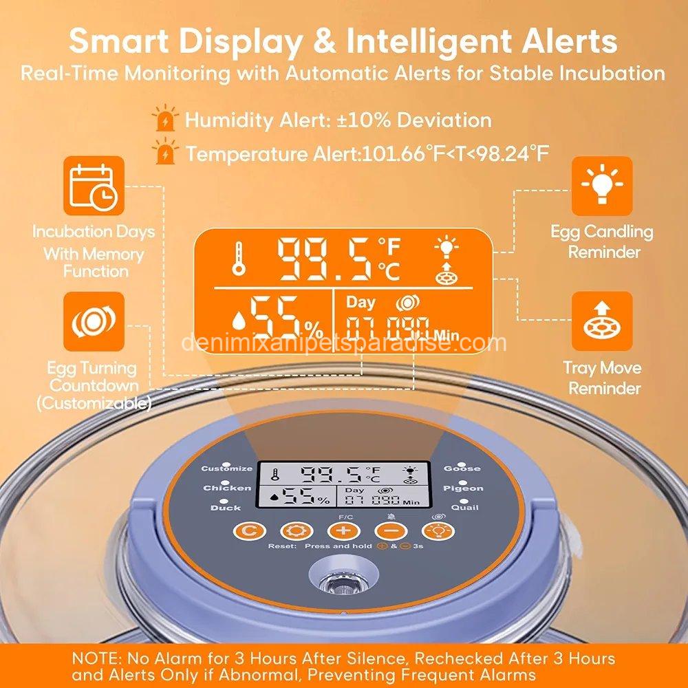 🔍 360° Clear View & Smart Features: Enjoy a full panoramic view of the hatching process with our transparent incubator cover. It also comes with an auto-turning egg system, incubation day counter, countdown timer for turning, egg candling reminder, and final-stage hatch tray alert—giving you complete control and peace of mind. - ⚠️ Smart Alerts & Insulated Packaging: Our incubator for chicken eggs features temperature & humidity alarms that activate only when necessary—checking every 3 hours instead of the frequent, annoying alerts from other brands. Plus, we include an insulated box to maintain stable conditions in colder environments, ensuring hatching success even in low temperatures.
