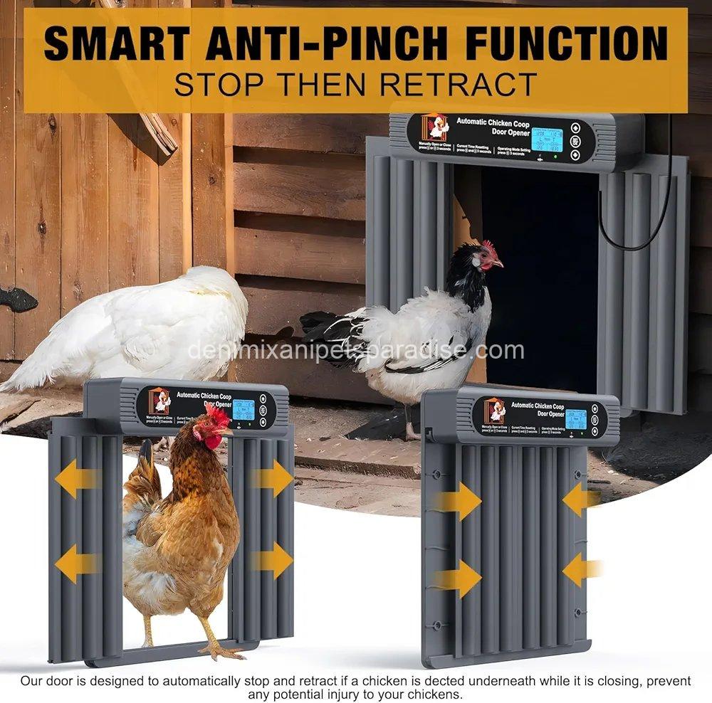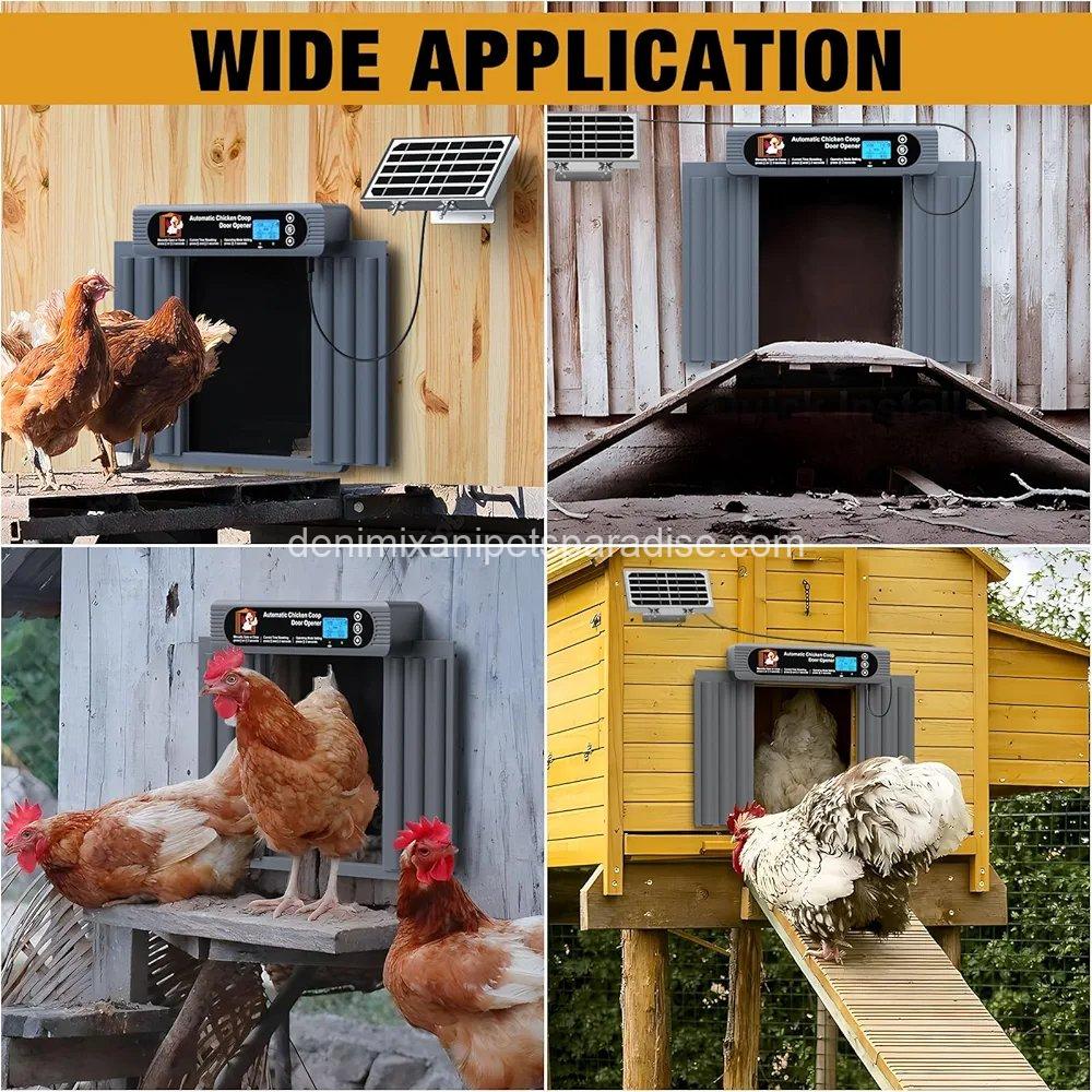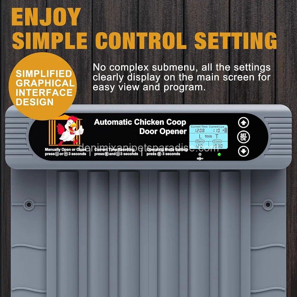 - [ Solar Powered Chicken Coop Door] Equipped with a high-capacity rechargeable battery, with up to 5 years of battery life. The high efficient solar panel keeps it continuously charged, eliminating the need for replacement of battery. Additionally, the USB charger adapter provides an option for convenient charging via an electrical outlet.[ Completely Safe ] The smart door will immediately stop and retract if detecting a chicken at the door when closing, this up-to-date anti pinch safety protection keeps your chickens from getting hurt.[ Large LCD Display ] Come with simplified graphical interface design, all setting are clearly displayed on the large LCD screen, super easy to program the working modes and monitor working status.