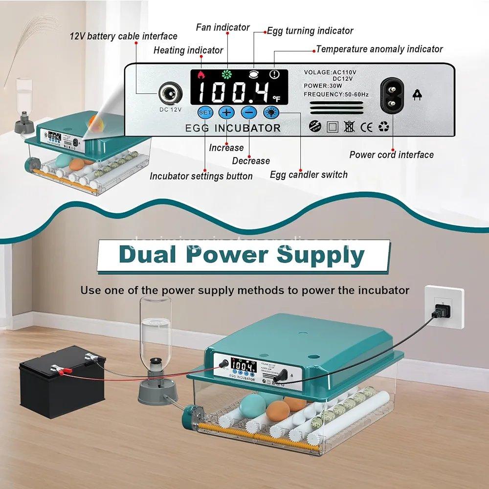 - Automatic Egg Turning: After the egg turning wire is connected, the incubator automatically turns the egg every 90 minutes to prevent the embryo from sticking to the eggshell and improve the hatching rate of the eggs